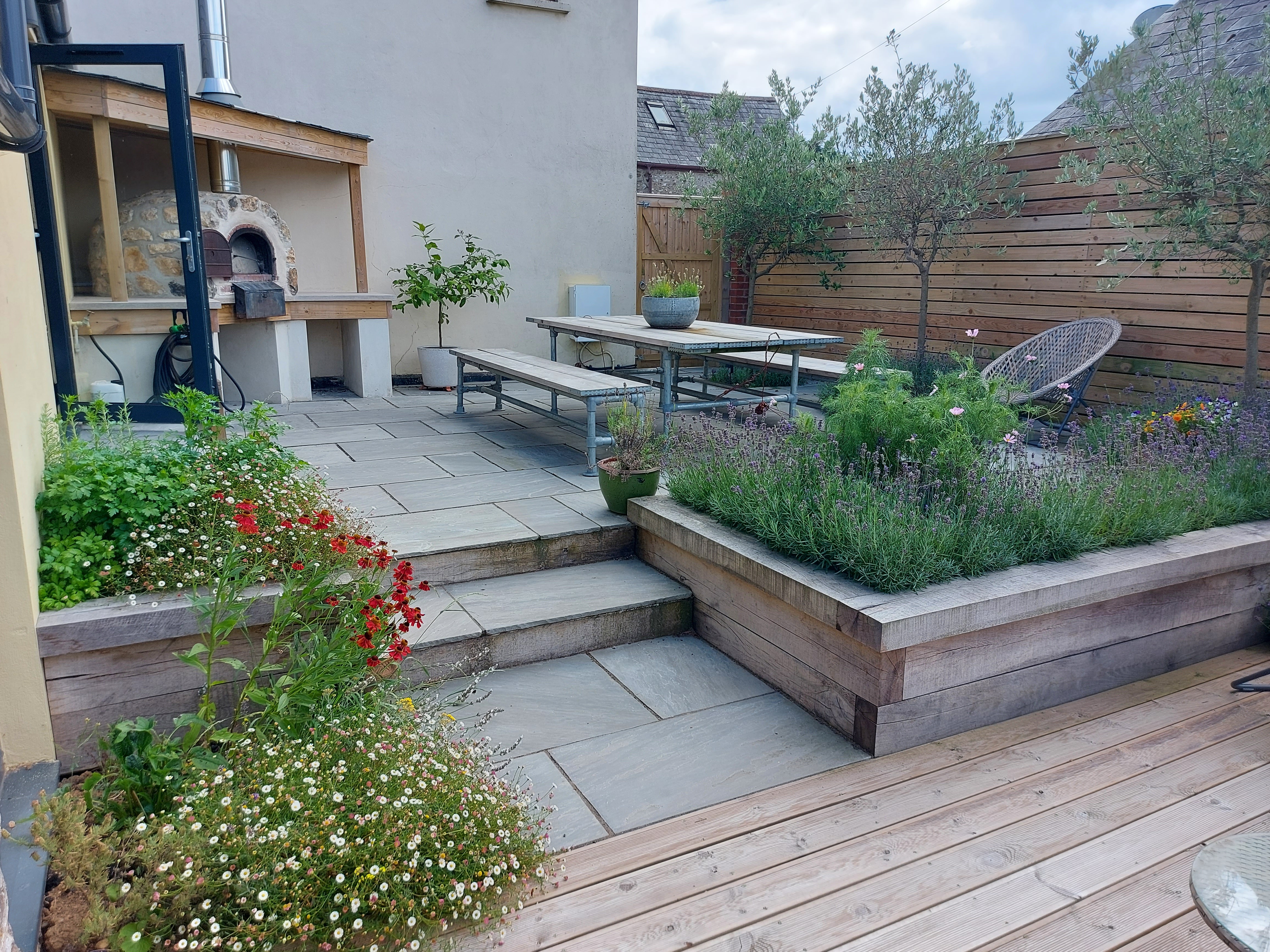 Designed to balance privacy with rural views, this all-seasons garden features inter-linked terraces and a fire pit. A covered outdoor station houses a relocated pizza oven, providing a functional workspace for the keen baker.