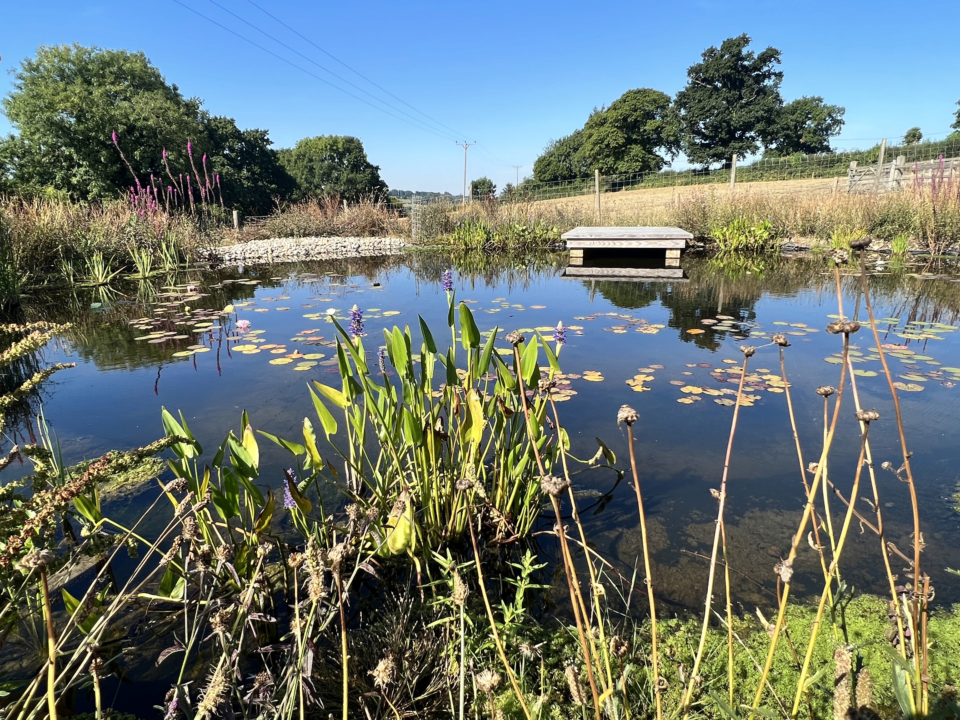 natural pond with swimming platform